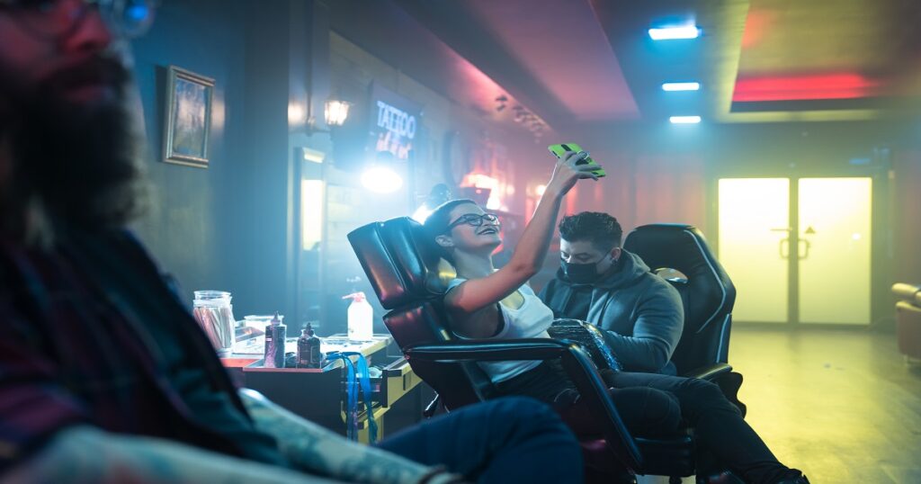 A pretty looking, biker, young white woman, takes a selfie for social media using her smartphone, while getting new body ink in a tattoo studio. Client in beauty parlor and fashion salon for body art.