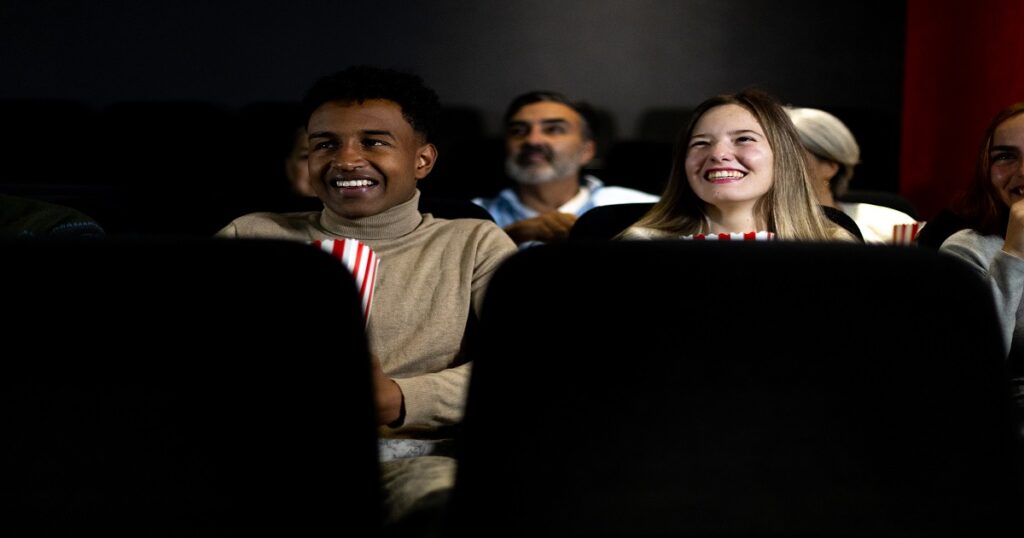 Diverse group of friends laughing and enjoying a comedy movie at the cinema, sharing popcorn and creating joyful memories together